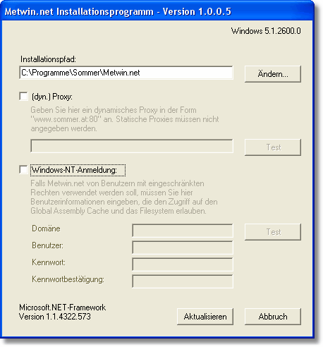 Auf NT-Systemen (Windows NT, Windows 2000, Windows XP) benötigt Metwin.net entsprechende Rechte, um auf das Dateisystem und den Global Assembly Cache zugreifen zu können. Geben Sie hier die entsprechenden Benutzerinformationen für die Anmeldung an. Bitte beachten Sie hierzu auch die zusätzlichen Hinweise für Windows 2000.