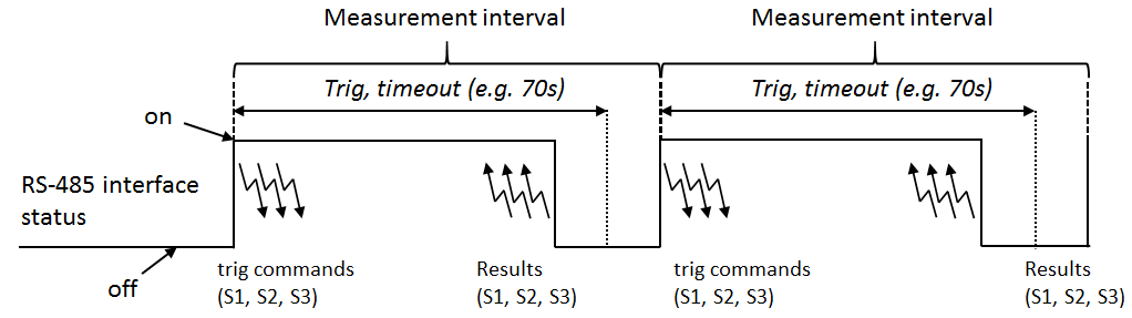 In polling mode the MRL-6.1 activates the RS-485 interface at the beginning of each measurement interval and sends a measurement command to the addressed sensors. If this command is not confirmed by a sensor it is re-sent a 2nd or 3rd time. As soon as all measurements have been completed and the requested results have been received within Timeout, the RS-485 interface is switched off automatically and remains idle until the next measurement interval.