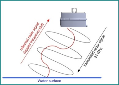 The contact-free measurement of the flow velocity is based on the principle of the Doppler Effect. The integrated velocity radar sensor transmits a signal with a constant frequency in a specific angle towards the water surface (see Figure 4). There, the signal is reflected and shifted in frequency due to the movement of the water body. The reflected signal is received by the antenna of the integrated velocity radar sensor. By comparing the emitted frequency to the frequency of the reflected signal from the water surface the local velocity can be determined.