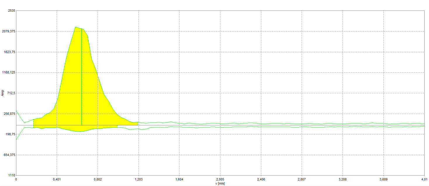 As illustrated in Figure 4 the radar spectrum is recorded for water flows up- and downstream. In the lower part of Figure 4 the velocity spectrum of water flowing away from the radar sensor is displayed, in the upper part the spectrum of water flowing towards the sensor. The yellow area is the part of the spectrum used for analysis and the vertical green line indicates the resulting velocity.